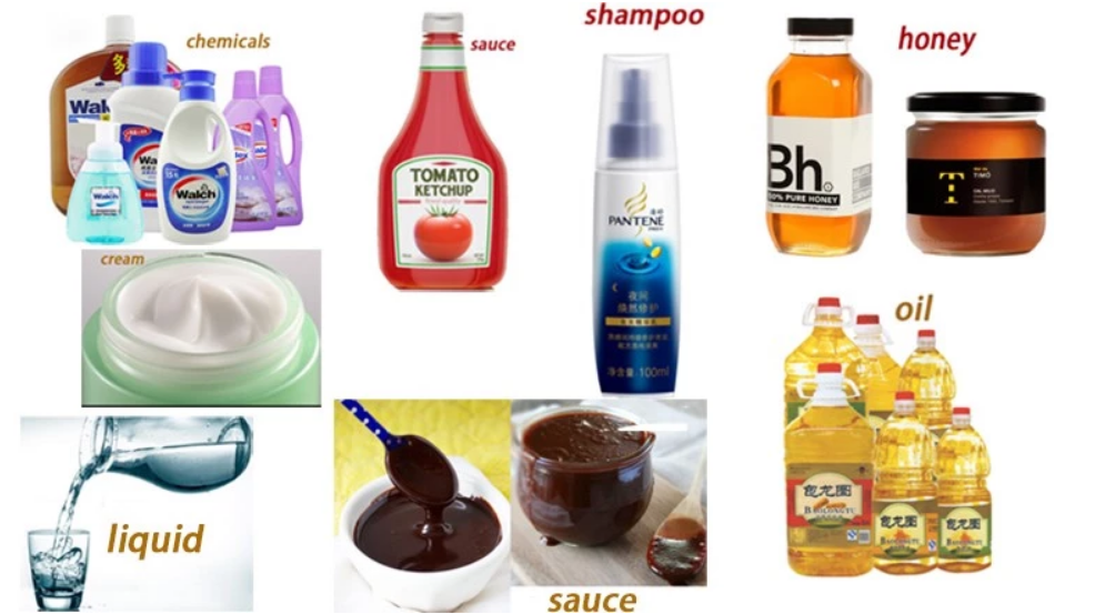 Líquidos semi-viscosos e viscosos; cacharros, mostaza, xaropes, salsa, maionesa, mel, manteiga de cacahuete, xeladas, salsas de bico, bálsamo labial, xampú, xabóns grosos, xeles para a estética, máscaras faciais, cera, cola, graxa, selantes, silicona e moito máis.