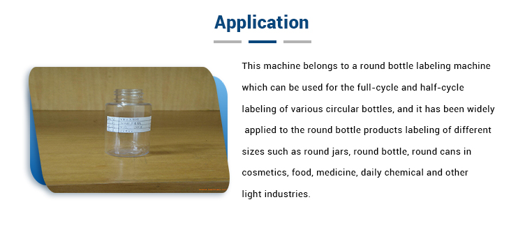 Esta máquina pertence a unha máquina rotuladora de botellas redondas que se pode usar para a etiquetaxe de ciclo completo e medio ciclo de varias botellas circulares, e foi aplicada ampliamente aos etiquetas de produtos de botella redonda de diferentes tamaños como tarros redondos, botellas redondas. , latas redondas en cosméticos, alimentos, medicamentos, produtos químicos diarios e outras industrias lixeiras. Composición de equipos: armario eléctrico, mecanismo de transmisión, dispositivo de botella separada, dispositivo de etiqueta de rolamento, dispositivo de etiqueta de cepillo, 1 # motor de etiquetaxe, sistema de operación e sistema de control.